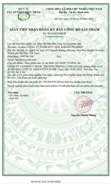 Giấy chứng nhận của viên uống An Giáp Vương