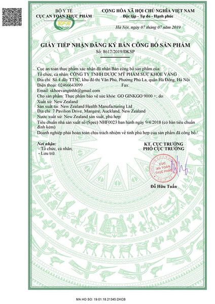 Giấy chứng nhận của viên uống Go Ginkgo 9000+
