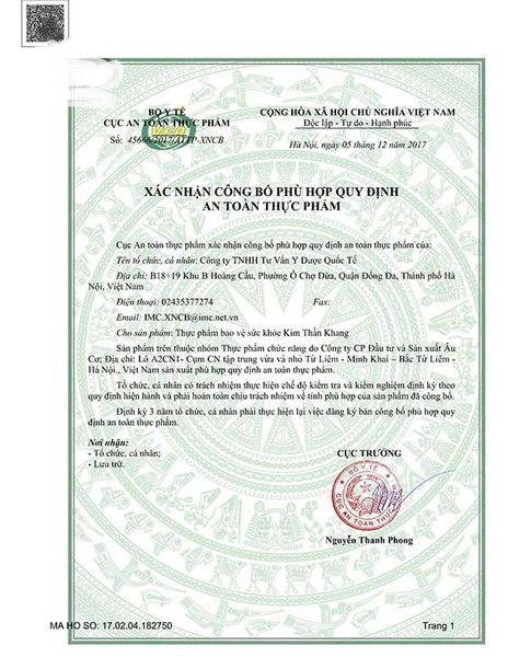 Hiện tại, sản phẩm đã được Bộ Y Tế cấp giấy chứng nhận đảm bảo an toàn thực phẩm và được cấp phép lưu hành trên toàn quốc.