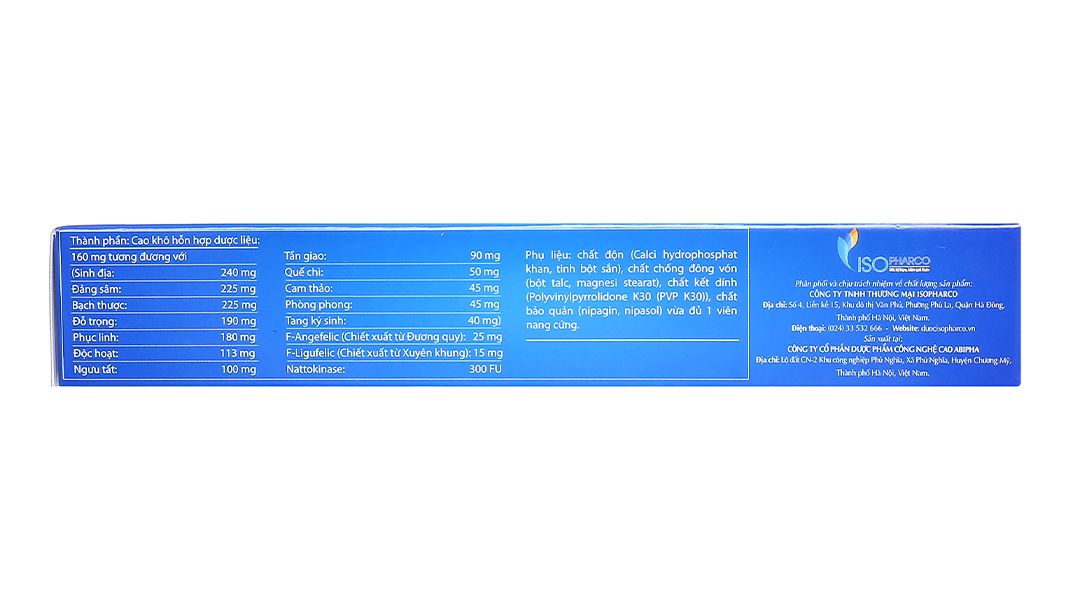 - F-Angefelic (Chiết xuất từ Đương quy) 25mg, F-Ligufelic (Chiết xuất từ Xuyên khung) 15mg, Nattokinase 300FU.