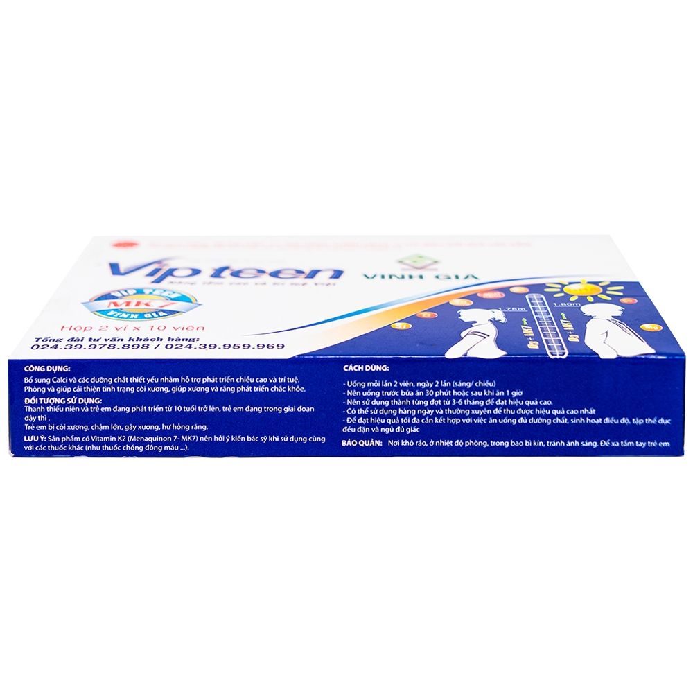 Thực phẩm bổ sung Vipteen Vinh Gia với bộ 3 vitamin và khoáng chất: Vitamin D - MK7 - canxi nano giúp trẻ tuổi teen phát triển chiều cao tối ưu, hỗ trợ xương và răng chắc khỏe, chống còi xương, tăng cường thị lực và trí não.